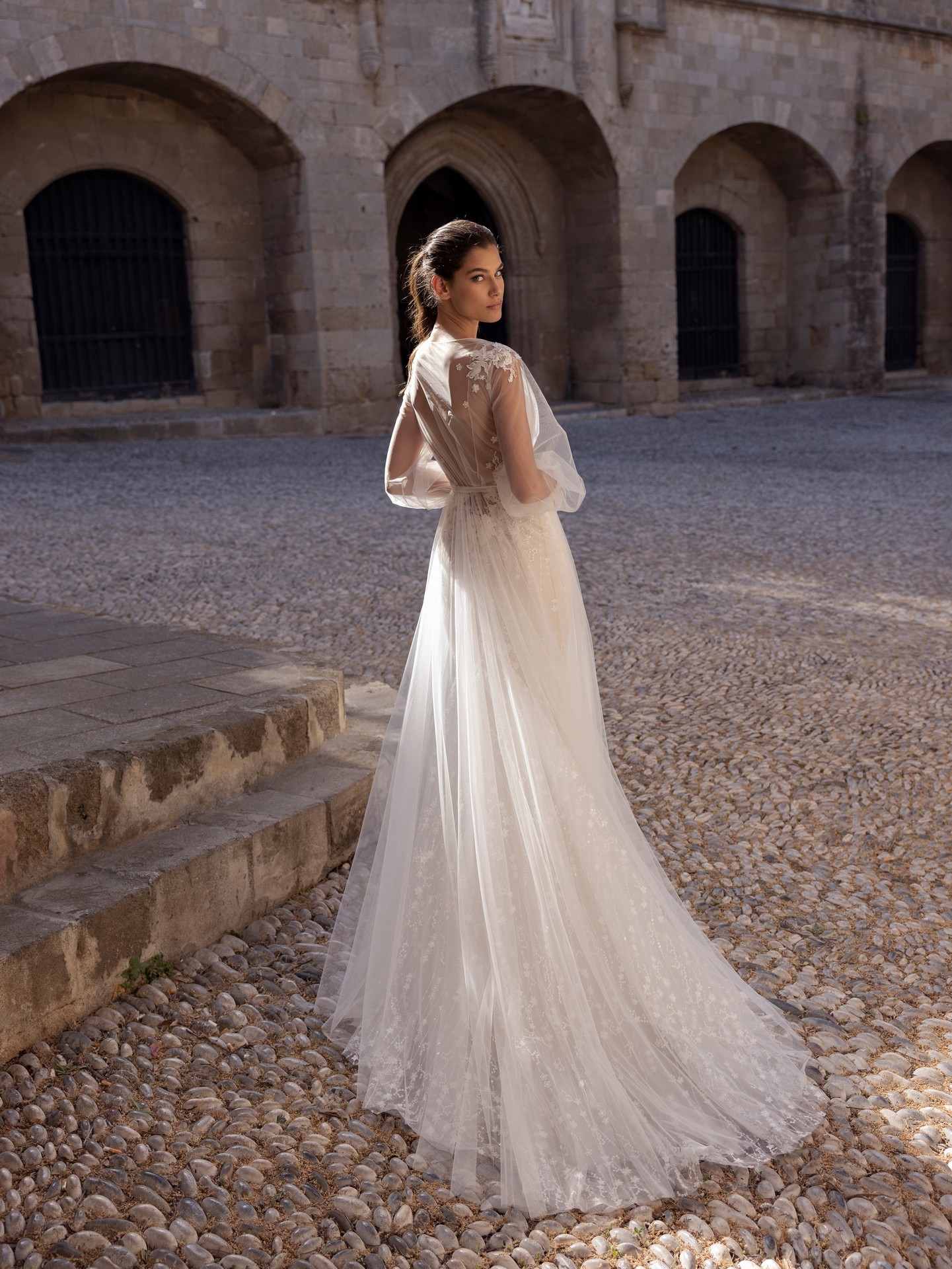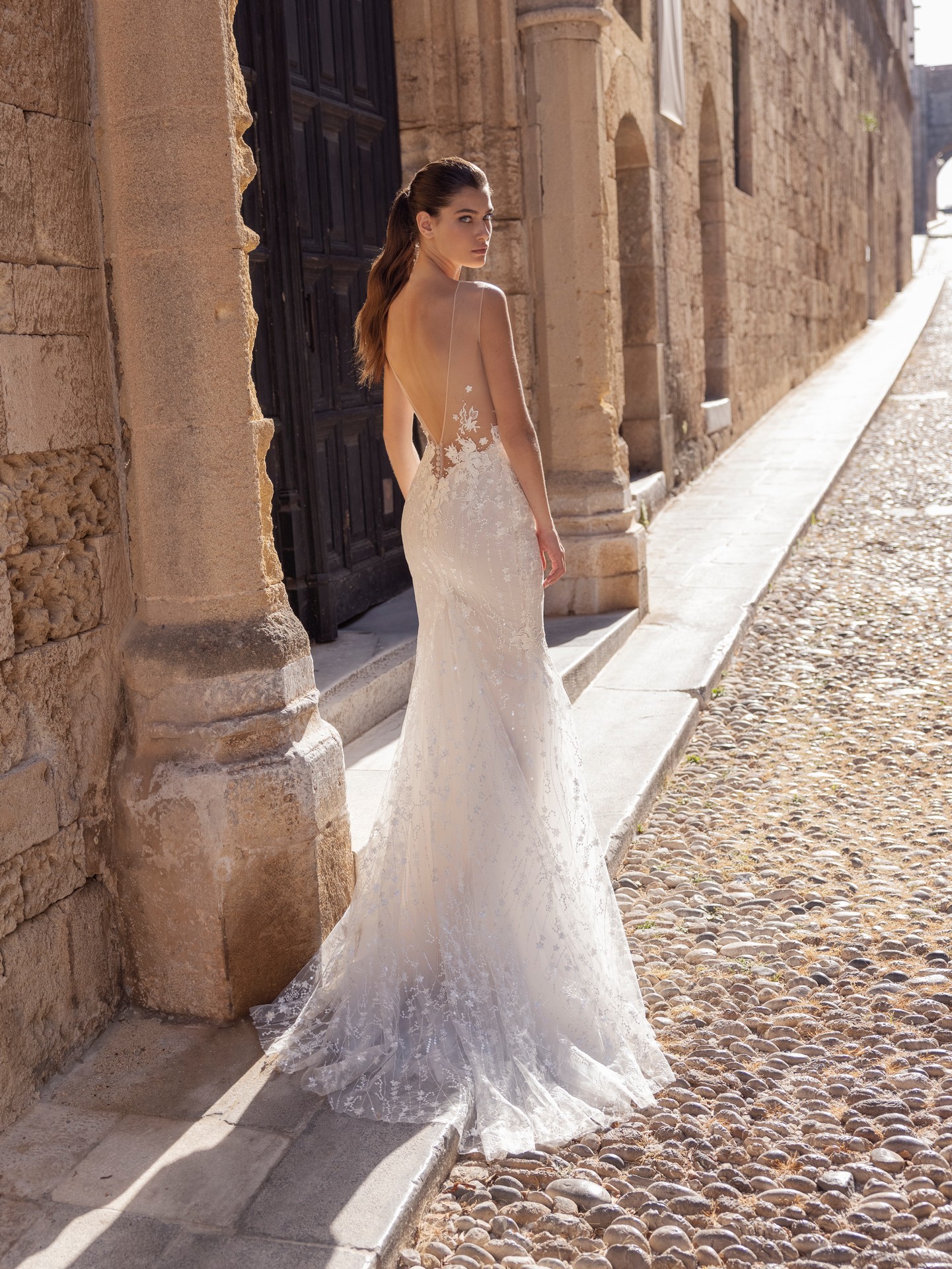 - The dress features a sweetheart neckline and a low back, adding a touch of romance and sensuality to your bridal look.