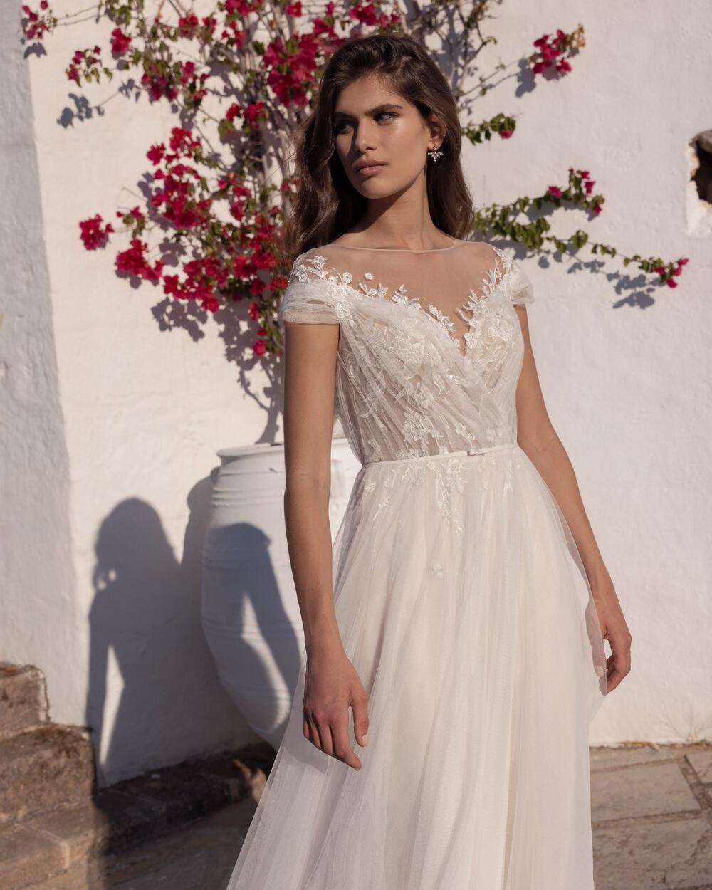 - The illusion plunge V-neck creates a flattering and daring neckline that will make any bride feel confident and beautiful.