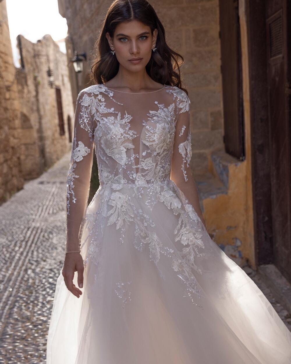 The STEPHANIA wedding dress is a stunning A-line gown that will make any bride feel like a true princess on her special day. The dress features intricate embroidery and delicate lace detailing on the long sleeves and bodice, adding a touch of elegance and sophistication. The flowing tulle skirt creates a dreamy, ethereal look that will leave you feeling like you're floating on air. The dress is designed to flatter your figure, with a fitted waist and a full skirt that will accentuate your curves in all the right places. Whether you're walking down the aisle or dancing the night away, the STEPHANIA wedding dress will make you feel beautiful, confident, and unforgettable.