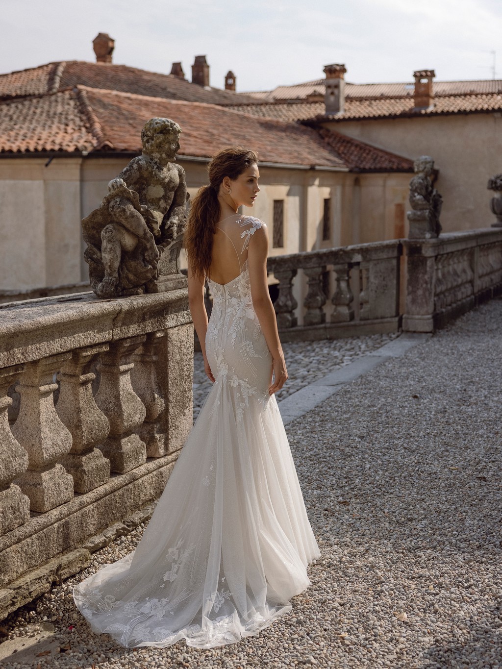 The TINA Embroidered Deep V-Neck Tulle and Lace Mermaid Wedding Dress is a stunning choice for any bride looking to make a statement on her big day. The intricate embroidery and delicate lace detailing create a romantic and feminine feel, while the deep V-neckline adds a touch of sexiness. The mermaid silhouette hugs the curves in all the right places, making the bride feel confident and beautiful. The tulle overlay adds a touch of whimsy and movement to the dress, making it perfect for a beach or outdoor wedding. Overall, this dress is a perfect choice for any bride who wants to feel like a true princess on her wedding day.
