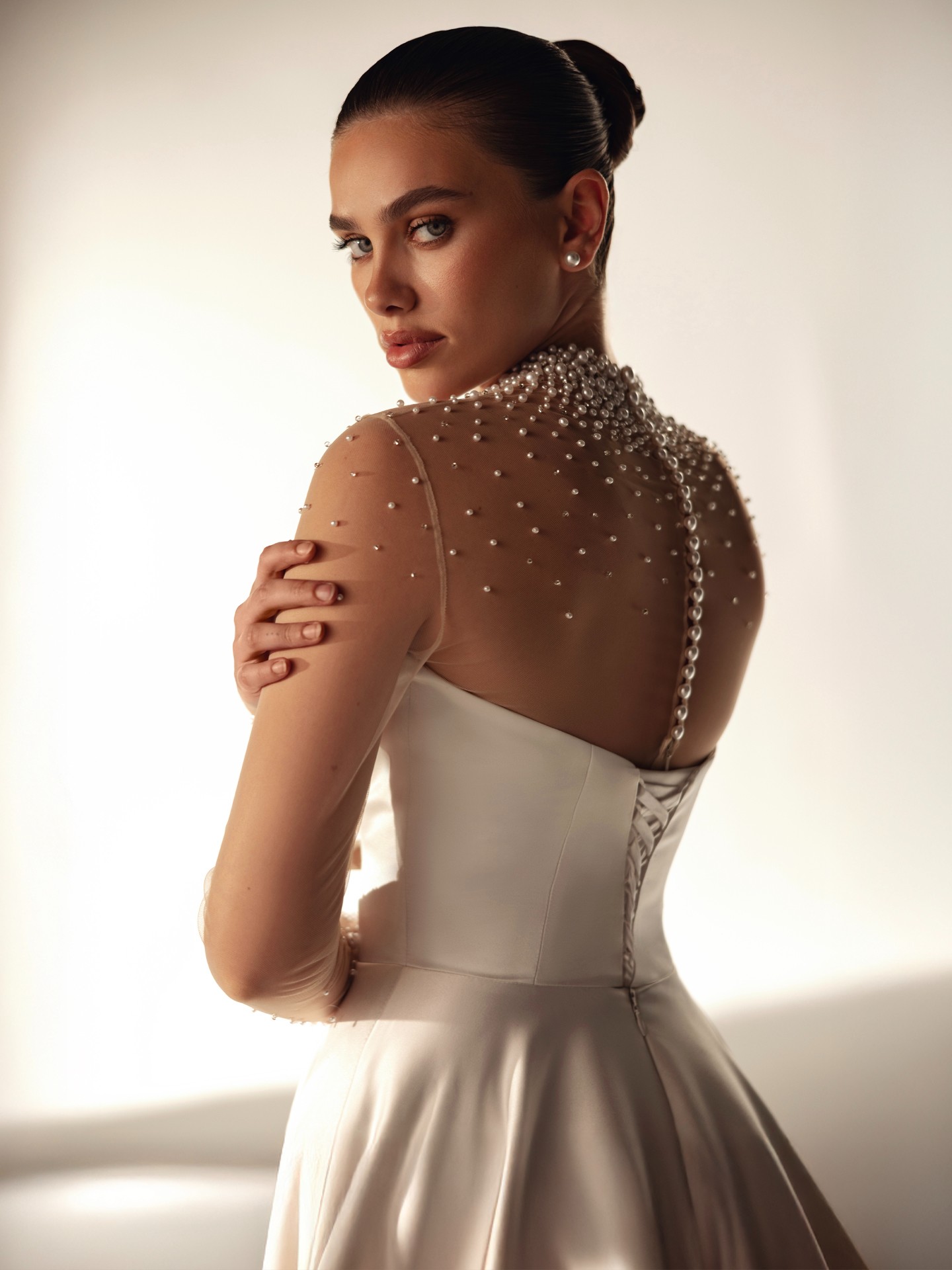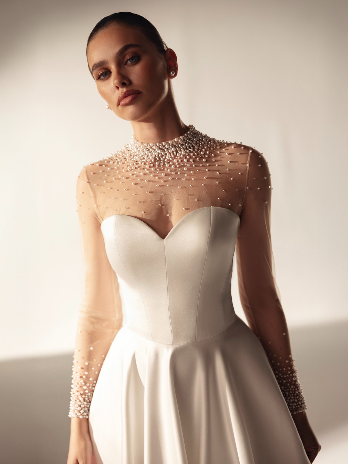 XENA Elegant Illusion Long Sleeve Wedding Dress - A-Line Court Train Sweetheart Illusion Neckline with Pearls
