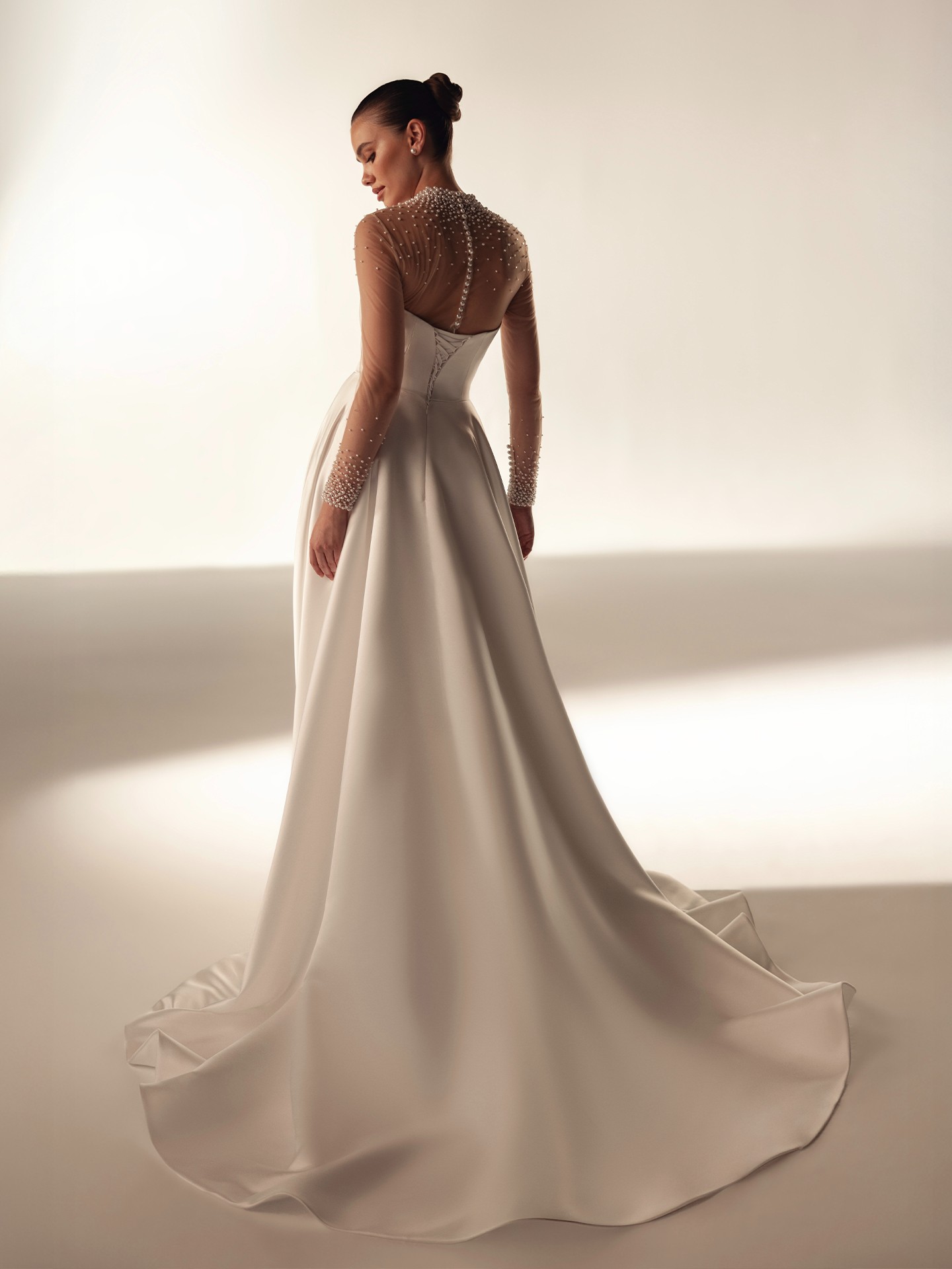 Home Lines LITE XENA Elegant Illusion Long Sleeve Wedding Dress - A-Line Court Train Sweetheart Illusion Neckline with Pearls